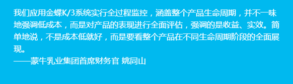 蒙牛集团总部和下属生产企业采用金蝶K/3,通过财务、供应链、生产、成本等功能模块的整合应用,实现集团化高速运营。